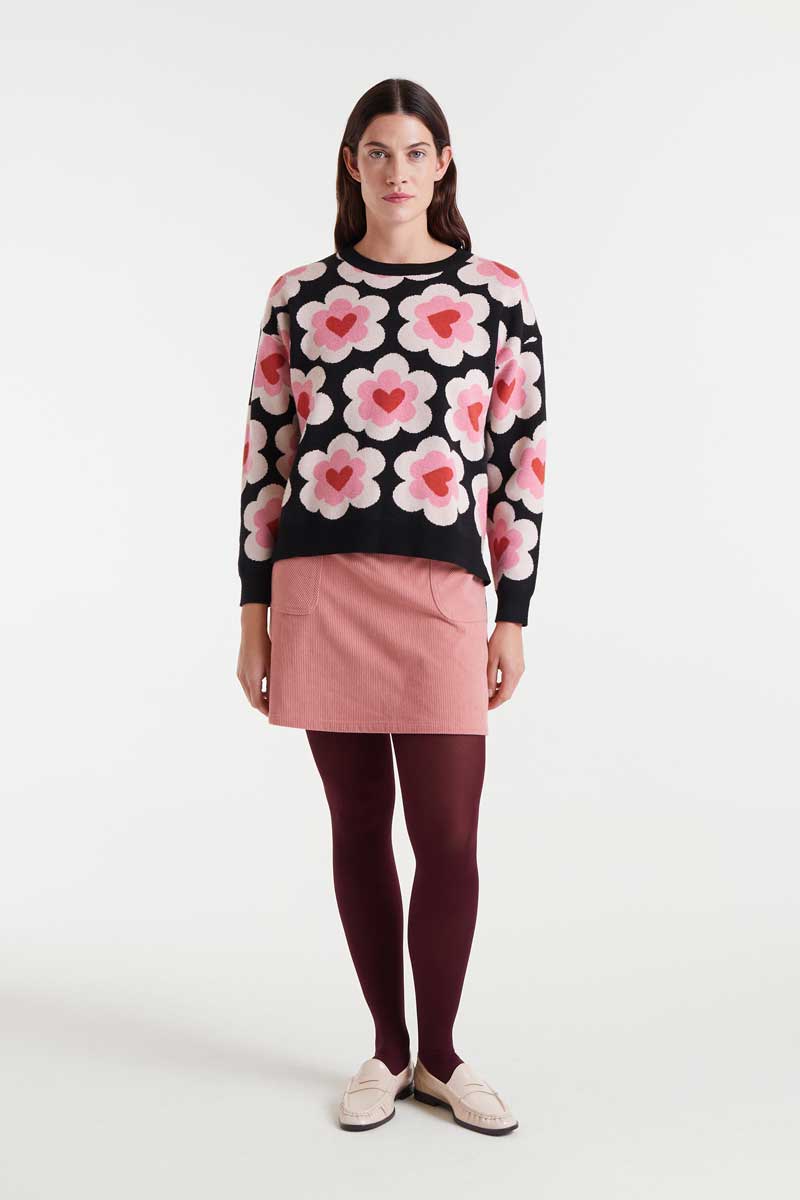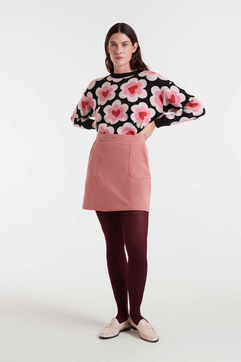 Κοντή φούστα από ροz κοτλέ ύφασμα.