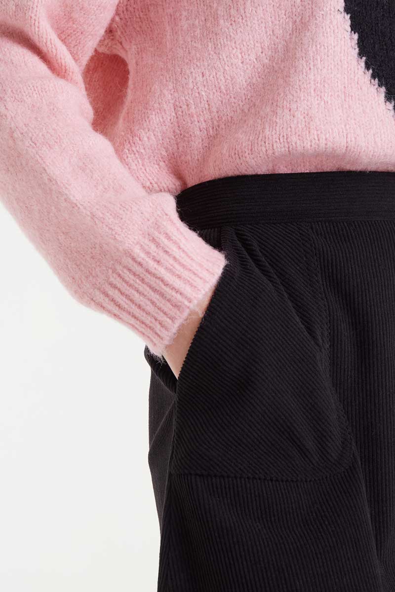 Κοντή φούστα από μαύρο κοτλέ ύφασμα.