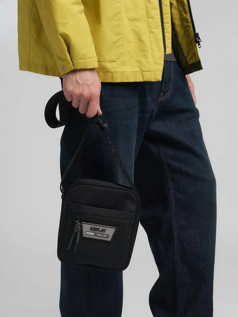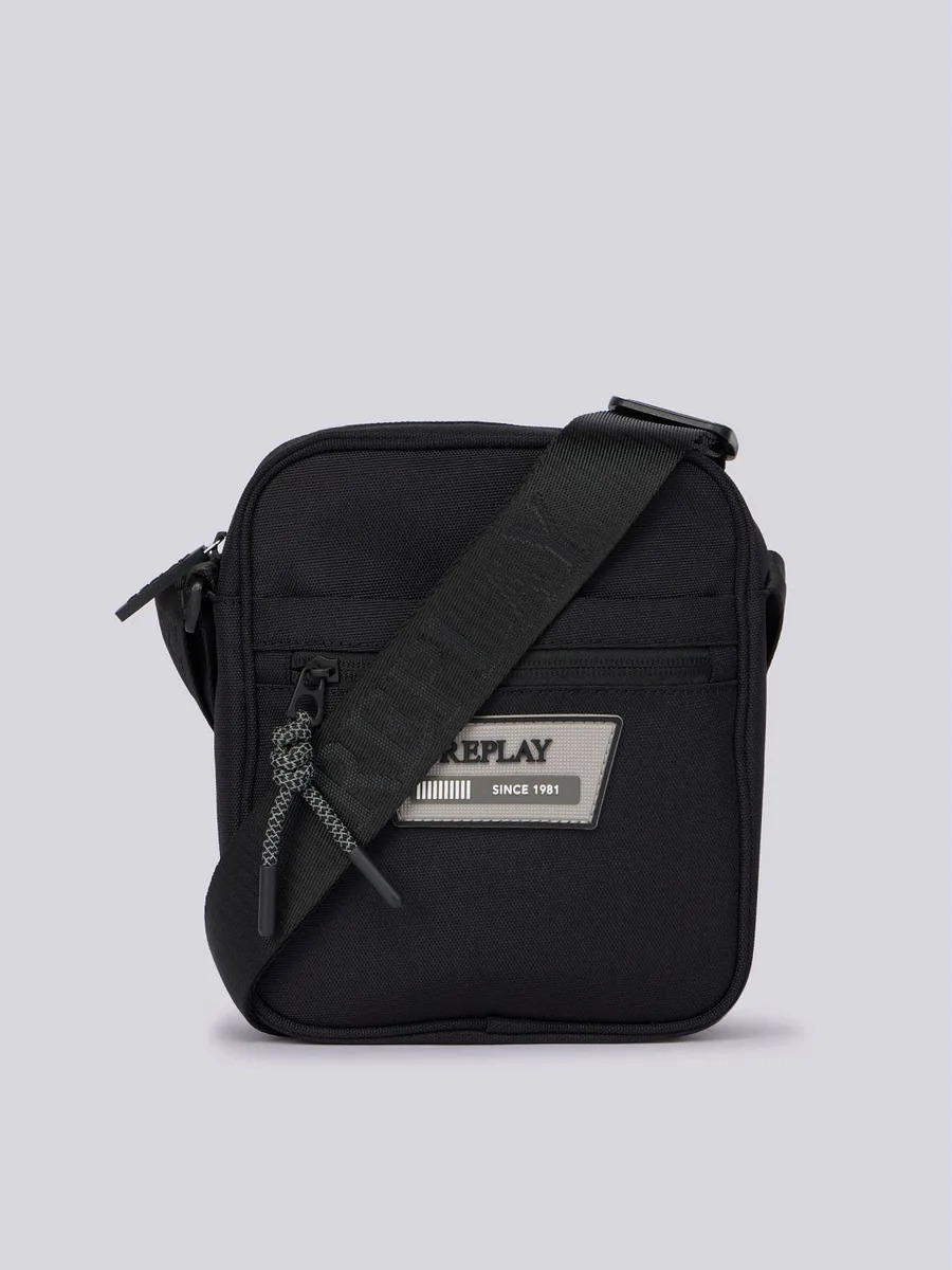 Τετράγωνη τσάντα κατασκευασμένη από τεχνικό ύφασμα με ρυθμιζόμενο λουράκι ώμου με ανάγλυφο λογότυπο.